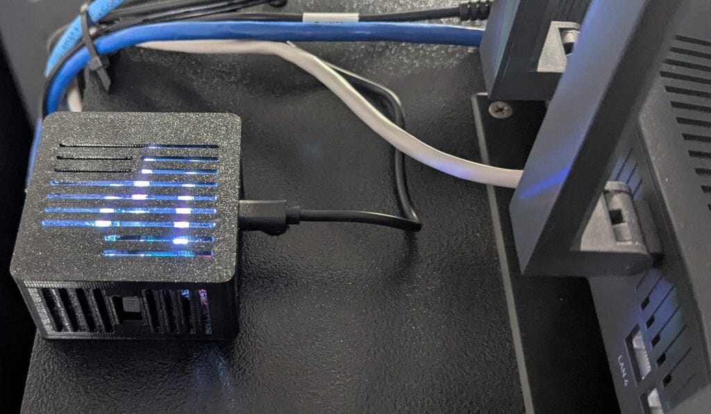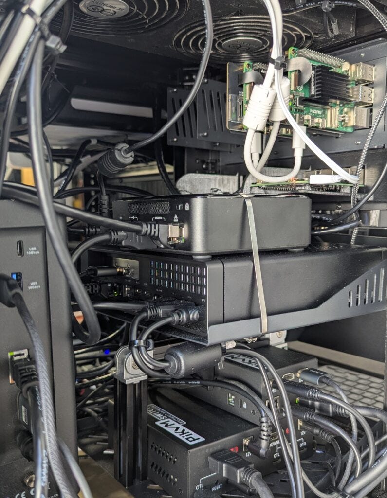 The machines are on the left half of the enclosure, in a configuration designed to optimize airflow. Convection helps elevate exhaust from the MS-01 when its GPU is cranking, and the NAS blows vertically over its heat sinks. The roof has two exit fans, one of which exhausts under the Flint router that can reportedly get hot at times. Spill from this speeds the response of an AIR-1 from Apollo, part of the Home Assistant installation that gives us excellent air quality and other sensor data.