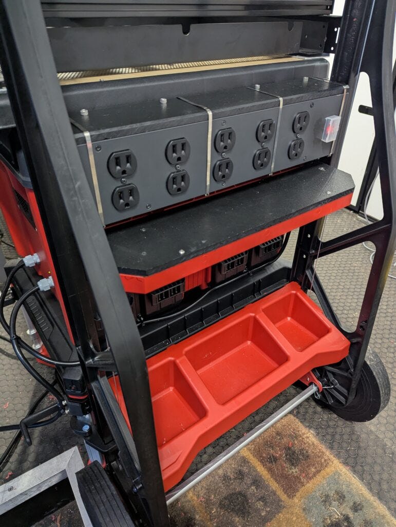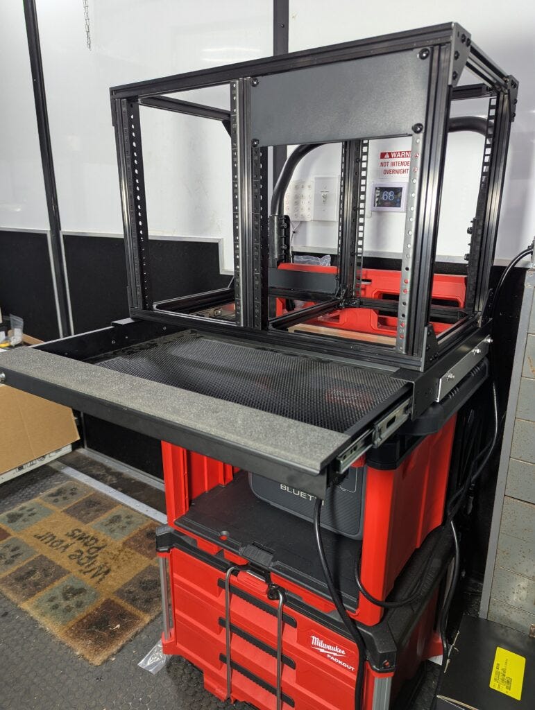 From the start, I wanted an integrated UPS to keep power stable, but incorporating that into the rack would gobble precious real estate. With that, and the need for a few drawers, I decided to integrate this onto a cabinet. That would be unmanageable without wheels… so I chose the Packout line from Milwaukee: