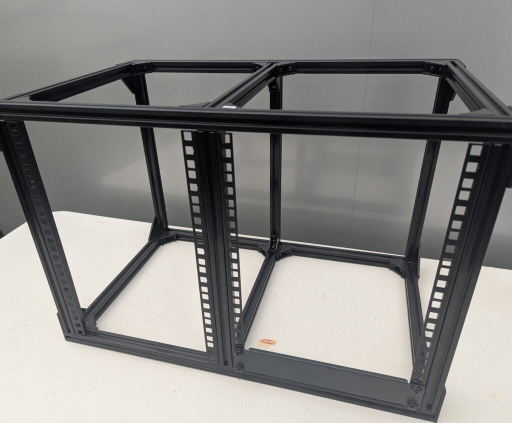 But as this started taking shape in my head, I realized that even a tall off-the-shelf rack was going to be a squeeze with all I wanted to do, so I made it a doublewide. I used standard 2020 extrusion to create this frame, with four 8U bays:
