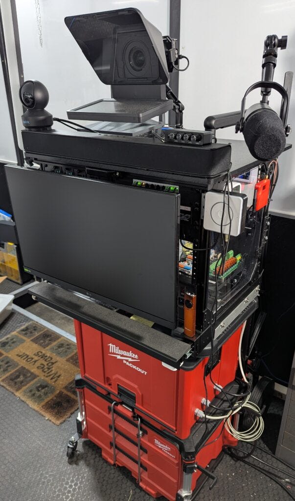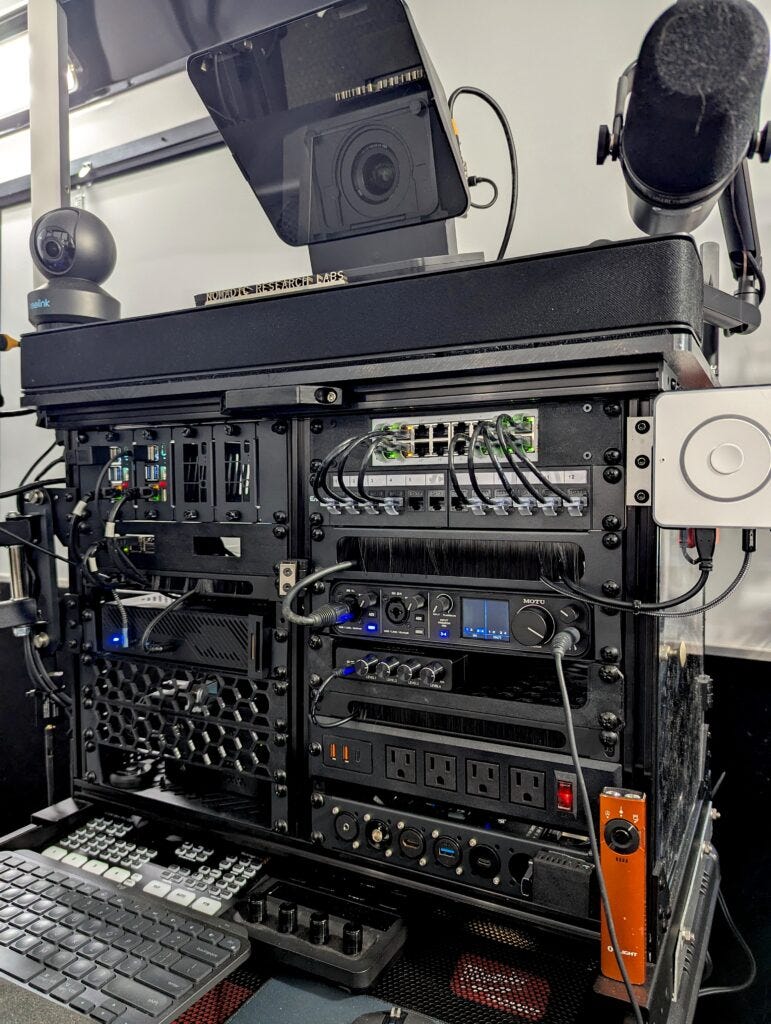 But if the point of this thing is to have all my gizmos on one device with wheels… does it need a nearby computer desk? No… there is a swing-out support arm for the laptop, which otherwise parks in one of the drawers. This owns the MOTU audio interface as well as ATEM for video production, and the Prompter does double-duty as a Zoom station with eye contact and local keylight. An HDMI connector is a pipe from external sources, so anything can talk to anything.