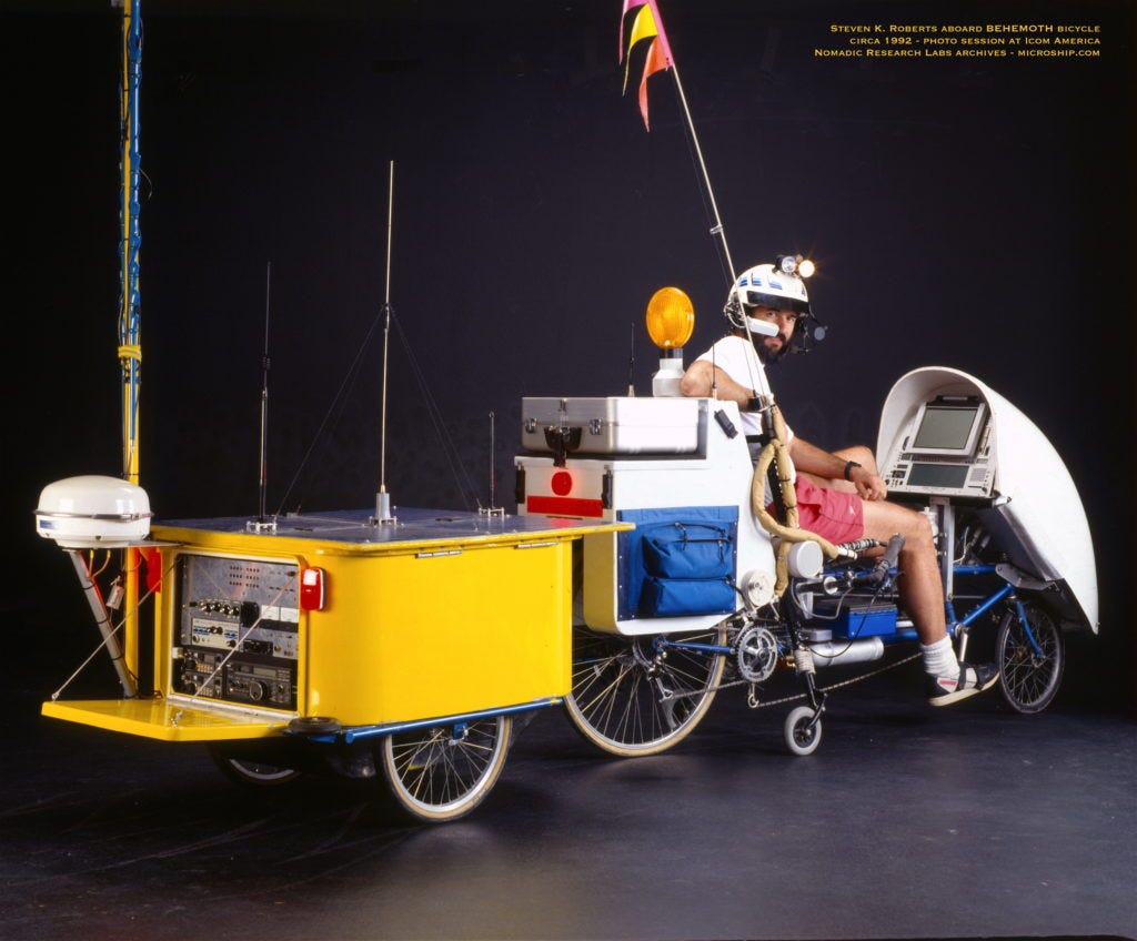 I have made a career of putting computers on wheels, starting with the Winnebiko recumbent in 1983. As the first “digital nomad,” I pedaled three versions of this 17,000 miles around the US, writing a book called Computing Across America that is being serialized here. The bike evolved into BEHEMOTH with binary handlebar keyboard and extensive computing resources — a 105-speed unixcycle that is now in the Computer History Museum.
