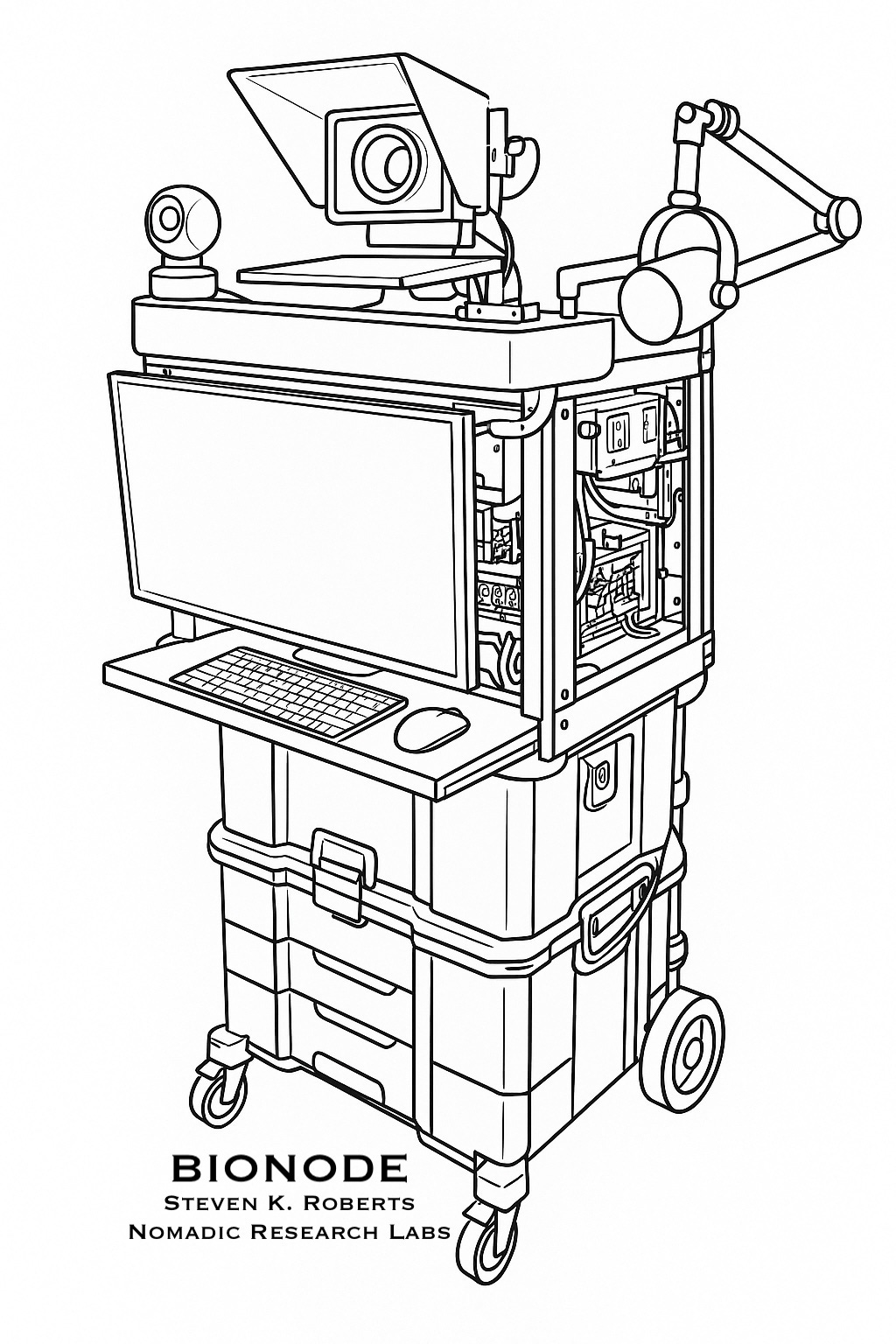 The contraption in the photos is Bionode, a 230-pound computational hand truck with 14TB of NAS, video and audio production, sensor suite, security, communications, embedded AI, on-board power with solar charging, development systems of many flavors, and archiving facilities with machine learning and a conversational front end.